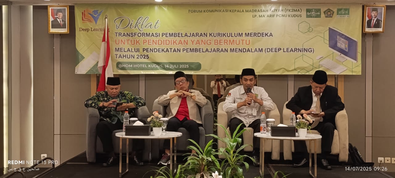 Kudus — Semangat transformasi pembelajaran mulai bergema kuat di MA NU Ma’arif Kudus. Hal ini tampak dari keikutsertaan aktif Kepala Madrasah, Zamroni, M.E., bersama Wakil Kepala Bidang Kurikulum, Ali Fathan, S.T., dalam kegiatan Diklat Kurikulum Berbasis Cinta yang diselenggarakan oleh Forum Komunikasi Kepala Madrasah Aliyah (FK2MA) LP Ma’arif PCNU Kabupaten Kudus, pada Senin (14/7/2025), bertempat di @HOM Hotel Kudus. Diklat yang mengusung tema “Transformasi Pembelajaran Kurikulum Merdeka untuk Pendidikan yang Bermutu melalui Pendekatan Pembelajaran Mendalam (Deep Learning)” ini diikuti oleh 54 peserta dari 27 madrasah anggota FK2MA. MA NU Ma’arif Kudus menjadi salah satu madrasah yang menunjukkan antusiasme tinggi dalam mengikuti seluruh rangkaian kegiatan.