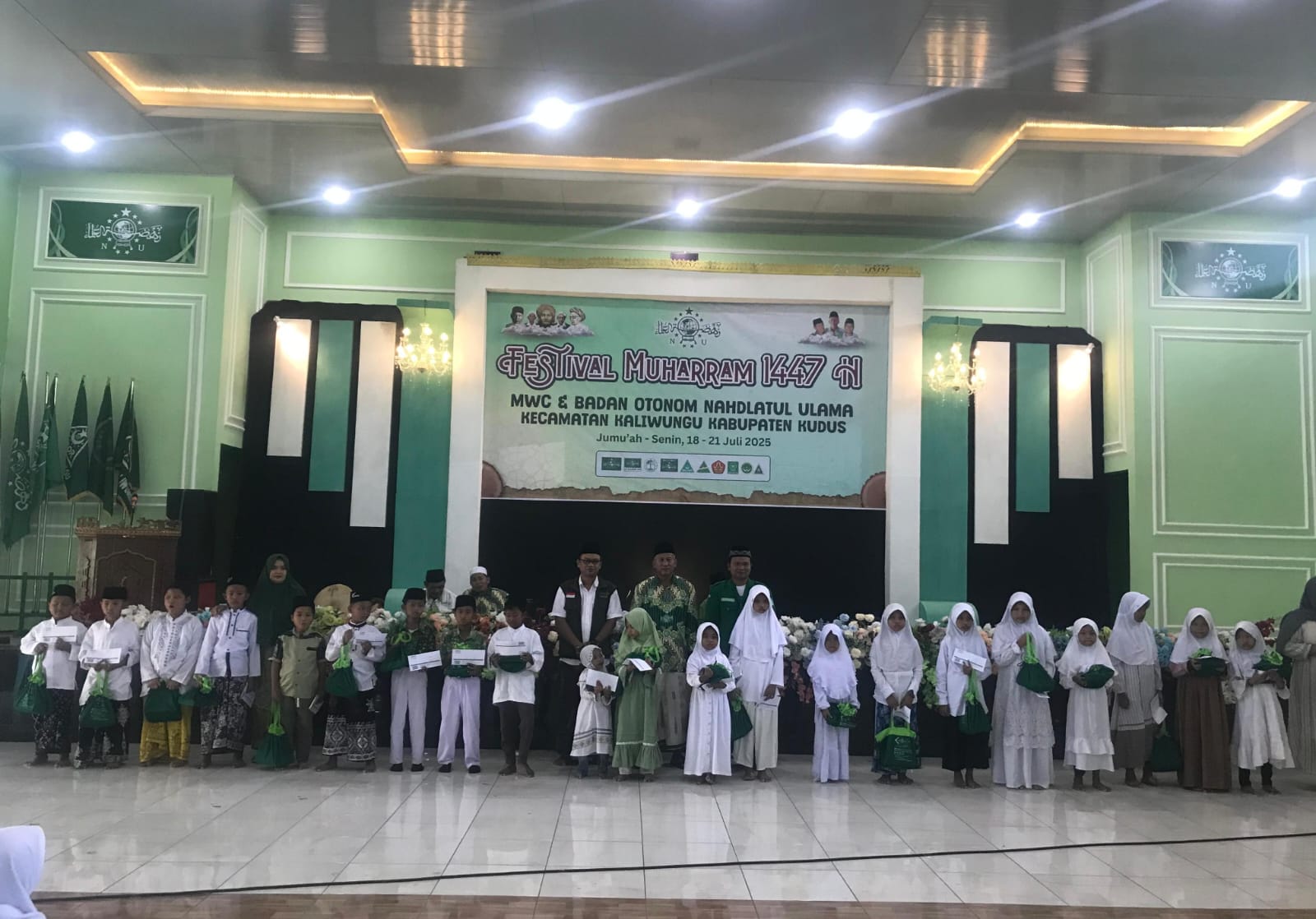Kaliwungu – Dalam rangka memperingati Tahun Baru Islam 1447 H, Majelis Wakil Cabang Nahdlatul Ulama (MWC NU) Kecamatan Kaliwungu, Kudus, bersama seluruh Badan Otonom dan lembaga di bawah naungan NU, menyelenggarakan rangkaian kegiatan Festival Muharram 1447 H. Kegiatan yang mengusung tema “Meneguhkan Semangat Hijrah, Merawat Tradisi, dan Menguatkan Ahlussunnah wal Jama’ah” ini berlangsung selama tiga hari penuh makna dan semangat kebersamaan. Rangkaian acara dimulai pada Jumat, 18 Juli 2025 dengan Khotmil Qur’an dan pembacaan Seribu Sholawat yang diikuti oleh jamaah dari berbagai desa se-Kecamatan Kaliwungu. Kegiatan ini menjadi pembuka spiritual untuk memperingati tahun baru hijriyah dengan lantunan ayat suci dan doa-doa penuh harapan.